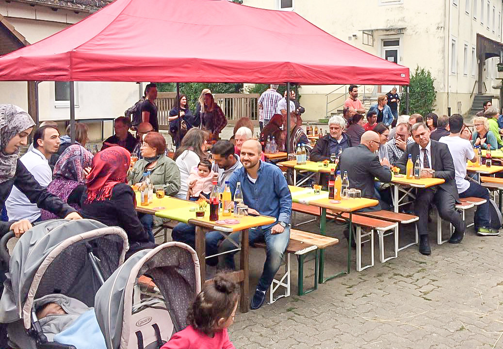 Landrat Thomas Schiebel begrüßte die rund 80 Gäste aus verschiedenen Helferkreisen, blickte kurz auf die vergangenen zwei Jahre zurück und bedankte sich auch im Namen von Gabriele Kimmel, der Geschäftsführerin des Caritasverbandes Main-Spessart: "In allen Städten und Gemeinden haben sich Ehrenamtliche zusammengetan, Helferkreise gegründet und sich um diejenigen gekümmert, die bei uns im Landkreis Schutz vor Krieg und Vertreibung gesucht haben. Dieser Abend ist ein kleines Dankeschön für Ihr unbezahlbares Engagement!" Auch gab er zu bedenken, "dass es jetzt um strukturierte Hilfsangebote geht, um die Menschen dabei zu unterstützen, sich bei uns in den verschiedenen Lebensbereichen zu integrieren - sei es bei der Wohnungssuche, der Integration in den Arbeitsmarkt oder die aktive Einbindung in die Ortsgemeinschaft. Denn nur gemeinsam können wir die Integration als gesamtgesellschaftliche Aufgabe in unserer Heimat vorantreiben." Franz-Josef Sauer, zweiter Bürgermeister der Stadt Arnstein, sah die großartige Hilfsbereitschaft als Zeichen gelebter Nächstenliebe hier im Landkreis. Doch für diesen Abend galt, diese Gedanken kurz beiseite zu schieben und den Moment zu genießen. Die großen und kleinen Gäste konnten sich am reichhaltigen Buffet bedienen und den gemütlichen Teil des Abends einläuten. Mit den sechs Trommlern von "Berxwedan" wurden die Gäste in orientalische Sphären entführt. Die Percussion-Gruppe aus Lohr begann als integratives Projekt und wurde binnen kurzer Zeit im ganzen Landkreis bekannt. Musikalisch begleitet wurde der Abend von dem Frammersbacher Trio "Take Three". Beide Gruppen sorgten für eine ausgelassene Stimmung, es wurde viel getanzt und gelacht. Für zusätzliche Begeisterung sorgte die Tanzeinlage der Gäste zu den Trommelrhytmen. Auch ein kurzer Regenschauer konnte die Laune aller Teilnehmer der rundum gelungenen Veranstaltung nicht trüben.