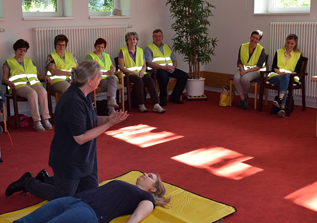 Frau Gabriele Ott vom Bayerischen Roten Kreuz begrüßte alle Anwesenden. Bei der Vorstellungsrunde wurde deutlich, dass jeder in einer Unfallsituation richtig helfen möchte, aber gleichzeitig hofft, dass diese Hilfe nie benötigt wird. Schnell wurde klar, vieles kann von vorangegangen Ausbildungen noch abgerufen werden, manches hat sich geändert aber es gibt auch immer wieder Neues zu lernen. In praktischen Übungen lernten wir wie man einen Druckverband richtig anlegt, wie und wann man einen Verletzten in die stabile Seitenlage bringt und einen Verband bei Fremdkörper in der Wunde (in unserem Fall steckte eine Schere in der Hand) anlegt. Nach einem gemeinsamen Mittagessen im Seniorenzentrum ging es dann auch gleich weiter. Wir behandelten das Thema Schock und übten auch die Schocklage. Die Herzdruckmassage und die Beatmung testeten wir nicht an den Kollegen, dafür gab es zum Glück eine Übungspuppe. Die Themen Schlaganfall und Herzinfarkt wurden ausführlich besprochen. Wie kann ich diese richtig erkennen und behandeln. Für alle war es ein interessanter und lehrreicher Tag mit viel Spaß und engagierten Kollegen, die sich bereitwillig als Unfallopfer und Helfer zur Demonstration zur Verfügung stellten. Wir alle wissen jetzt, im Notfall können wir immer reagieren und auf jeden Fall haben wir die Notfallnummer 112 immer parat.