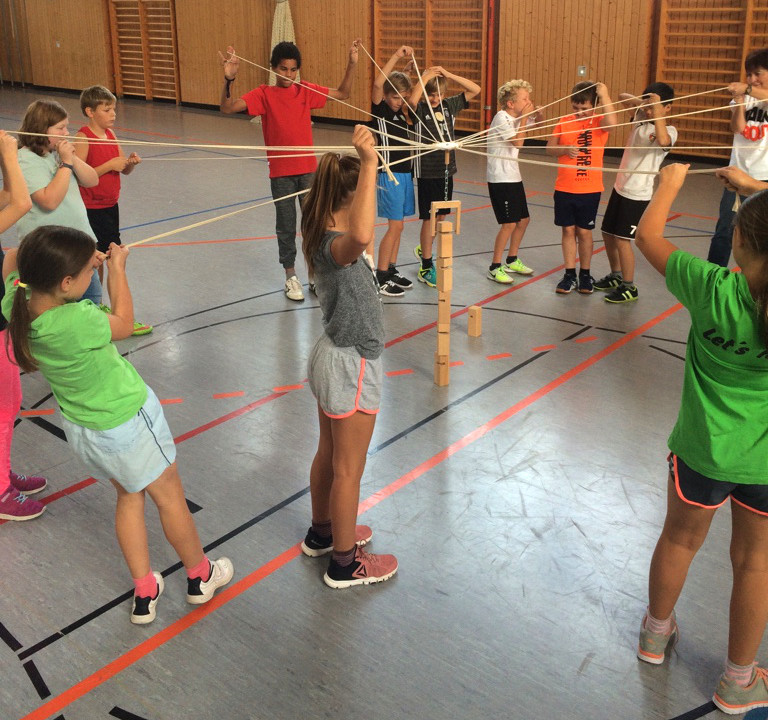 Nach so viel Denkarbeit und Diskussion waren alle hungrig. In der Schulküche wurden von der Klasse Pizzabrötchen zubereitet und anschließend an den schön gedeckten Tischen gemeinsam gegessen. Nach einer kurzen Mittagspause begann der Endspurt in der Turnhalle, in der die Klasse bei verschiedenen Spielen nochmal ihren Teamgeist unter Beweis stellen konnte. Favoriten waren hierbei eindeutig der „Fröbelturm“, bei dem die Klasse nur wenn sie zusammenarbeitete das Ziel, nämlich den Bau eines Turmes, erreichen konnte. Ein Balancespiel bei dem alle Kinder ein Seil spannen mussten, über das dann eine Schülerin oder ein Schüler balancieren durfte.
