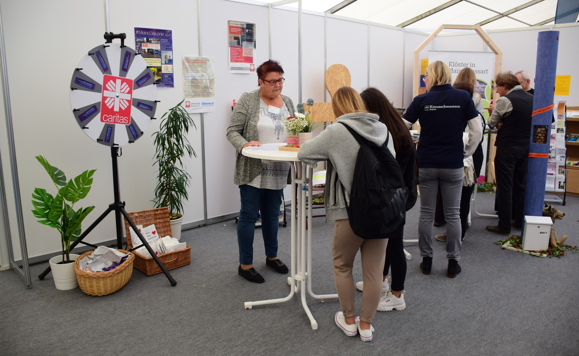 Neben dem Pflegestand gab es gemeinsam mit Klöstern, Wallfahrern und weiteren Angeboten der Kirche in Main-Spessart die Möglichkeit für den Caritasverband Main-Spessart mit der Diakonie die kirchlichen Wohlfahrtsverbände im Kirchenstand zu präsentieren.