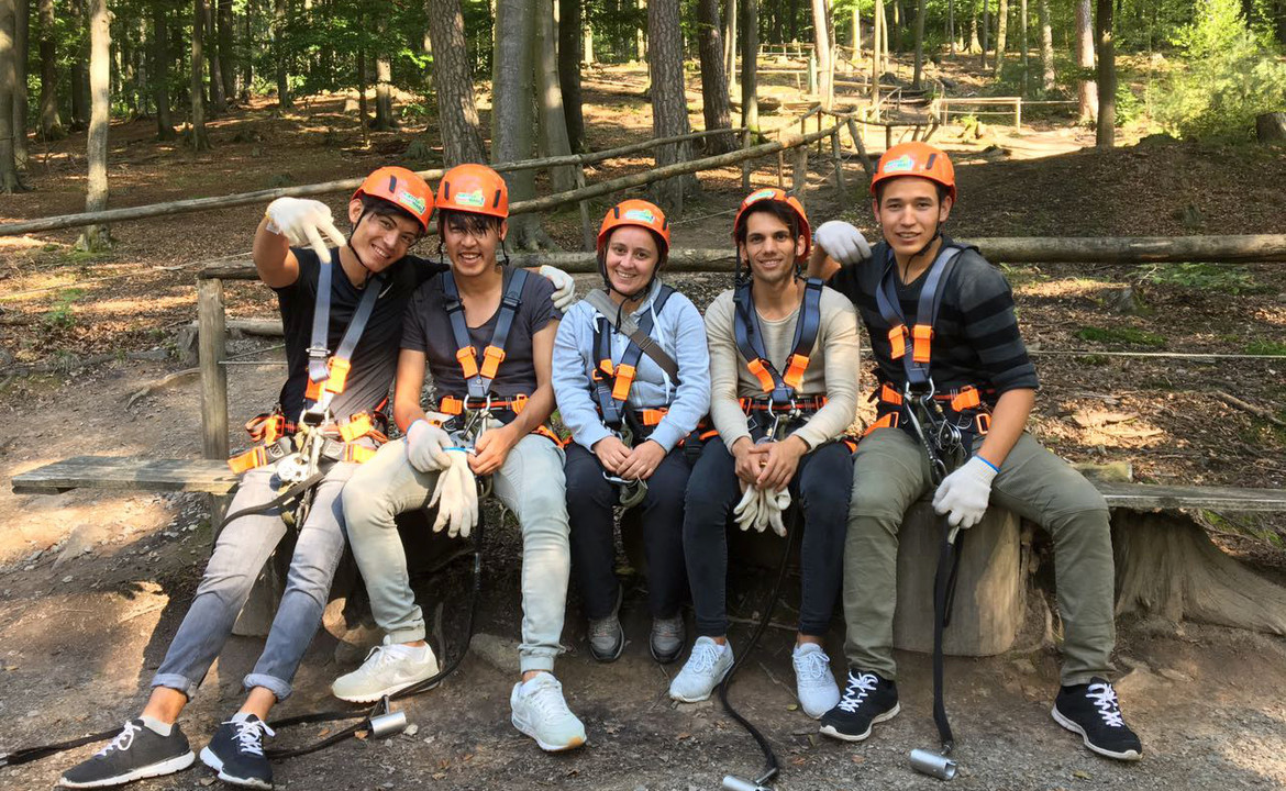 Nach einer Einführung in die Sicherheitshinweise wurde vom Trainer empfohlen mit einem leichten Parcours zu beginnen. Doch schon bald zeigten die Jugendlichen viel Geschicklichkeit und Balance auf den verschiedenen Kletterabschnitten und versuchten sich durch Wackeln an den Seilen, das Klettern gegenseitig zu erschweren. Nach dem dritten Parcours entdeckten die Afghanen den „Flying Fox". Bei dieser 600 Meter langen Seilrutsche geht es in 30 Metern Höhe über das Tal. Beim Absprung zögerte ein Jugendlicher zunächst, konnte sich aber durch gutes Zureden der Anderen ermutigen lassen. Die jungen Männer waren von der Seilrutsche so begeistert, dass dies gleich mehrmals gefahren wurde. Aber auch bei den zwei schweren Parcours hatten alle sehr viel Spaß und meisterten die schwierigen Passagen mit gegenseitiger Unterstützung. Nach drei Stunden waren die jungen Männer erschöpft und stärkten sich mit Brötchen und Müsliriegel. Nach der gemeinsamen Brotzeit fuhren alle müde und ausgelastet zurück nach Altfeld.