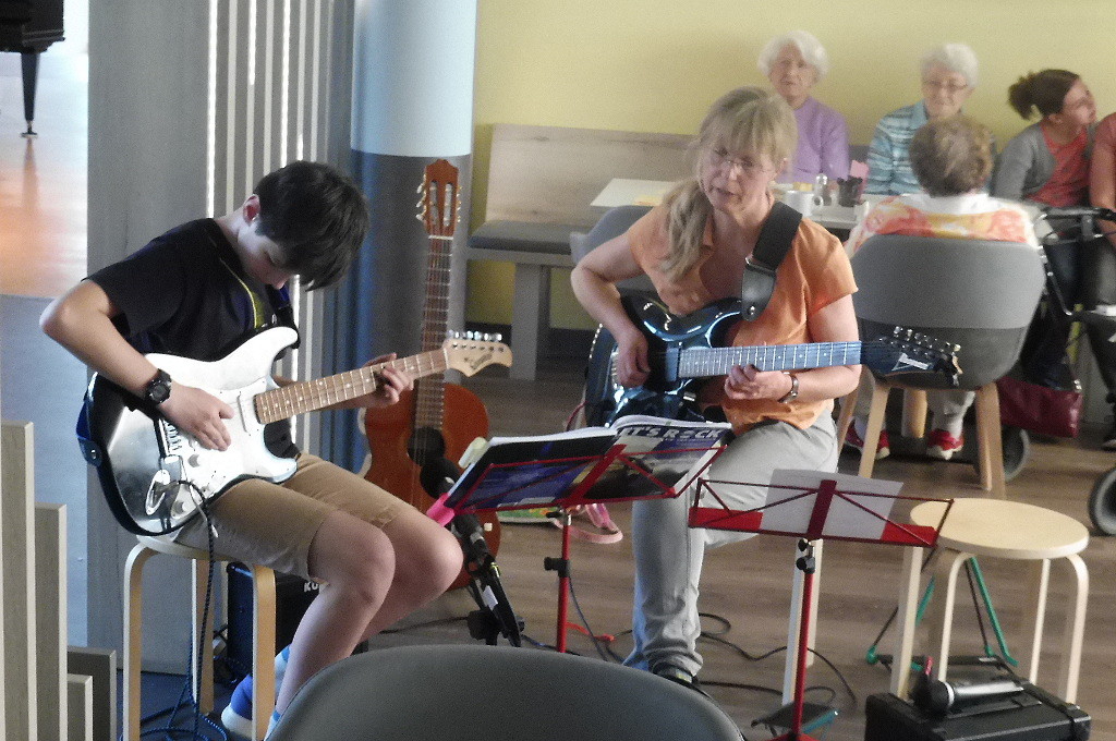 Die Gitarrenschüler zeigten den Senioren, was sie in kurzer Zeit bereits erlernt haben und gaben kurze unterhaltsame Stücke zu ihrem Besten. Sozialdienstleitung Christina Fröba bedankte sich bei den Kindern mit einer kleiner „Naschtüte“ als Aufmerksamkeit