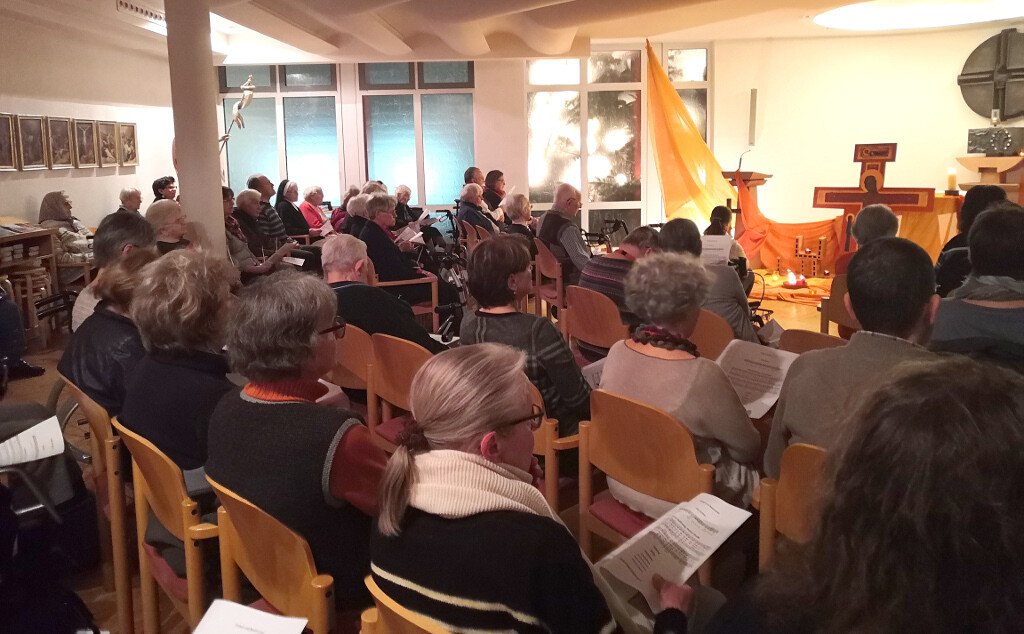„Christus, dein Licht, erstrahlt auf der Erde und du sagst uns: Auch ihr seid das Licht“ erklang es aus der von Kerzenschein beleuchteten Kapelle des Caritas Seniorenzentrums St. Martin. Am 03.12.19 lud der Caritasverband für den Landkreis Main-Spessart zusammen mit evangelischer und katholischer Kirche zu einer ökumenischen Taizé-Andacht ein. Um Licht in die trübe Jahreszeit zu bringen war der Altarraum der Kapelle, wie üblich bei Taizé-Gebeten, mit Kerzen und bunten Tüchern geschmückt und strahlte eine warme Atmosphäre aus. Der Caritas-Mitarbeiterchor unter der Leitung von Silvia Schäfer begleitete die Andacht musikalisch und wurde tatkräftig von den Anwesenden unterstützt. Rund 50 Personen aus den Gemeinden, dem Seniorenzentrum und aus den Diensten der Caritas nahmen daran teil. Die Anwesenden beteten und sangen gemeinsam, wurden still und trugen ihre Anliegen vor Gott. Sehr berührend wurde es, als viele Besucherinnen und Besucher aufstanden, eine Kerze am Altar entzündeten und eine Fürbitte für Verstorbene, Kranke oder persönliche Sorgen vorbrachten. Das Organisationsteam freut sich sehr, dass so viele ihren Alltag der ersten Adventswoche unterbrochen haben um abzuschalten und durch den meditativen Charakter der Andacht eine Stunde bei sich selbst zu verweilen. Beim anschließenden Beisammensein mit Plätzchen und Punsch war eine Beseeltheit unter den Teilnehmenden zu spüren, die zeigt, dass der Geist dieser Andacht in der Stille des Herzens weiter klingt. Sehr oft kam die Frage auf, wann macht ihr das wieder. So können Sie lieber Leser, liebe Leserin, sicher sein – eine Einladung folgt.