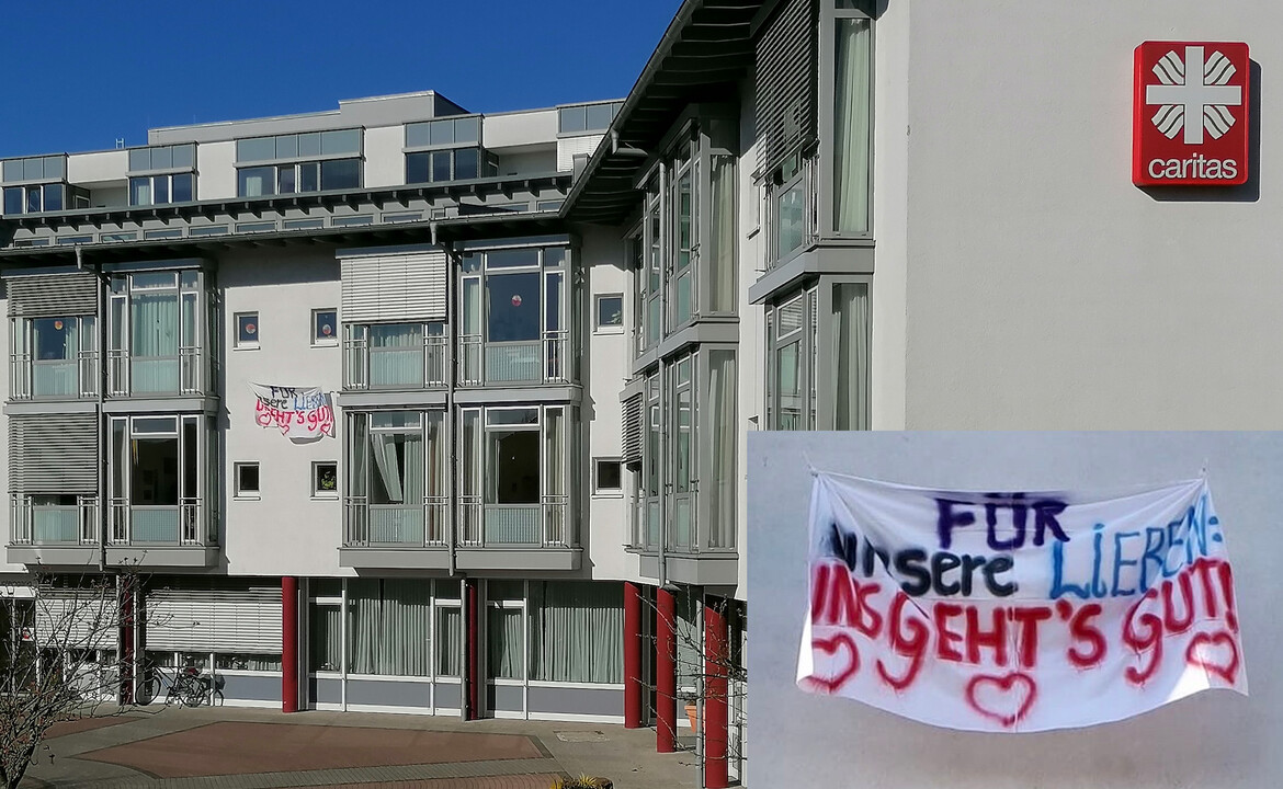 Seit Freitag, 27.03.20 hängt ein großes selbstbemaltes Tuch an der Fassade des Seniorenzentrums St. Martin. Mit den Worten "Für unsere Lieben: Uns geht´s gut!" grüßen die Bewohnerinnen und Bewohner ihre Angehörigen. Wegen der Ausbreitung des Coronavirus CoVid-19 sind aus Sicherheitsgründen seit 16. März keine Besuche mehr im Seniorenzentrum erlaubt. Für Angehörige, Bewohner und auch Mitarbeiter ist das eine besondere Situation, die es derzeit zu meistern gilt.