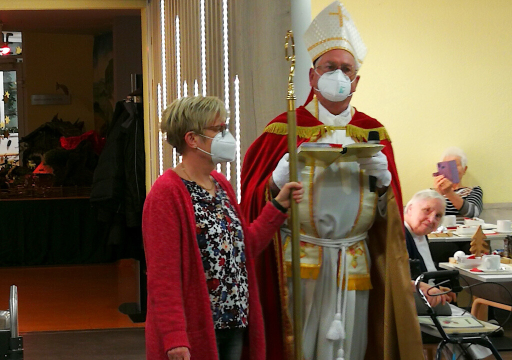 Auch wenn der Nikolaus aufgrund der Hygiene-und Abstandsregeln den Senioren nicht die Hand reichen durfte, war die Freude groß als der stattliche heilige Bischof Nikolaus das Haus betrat.