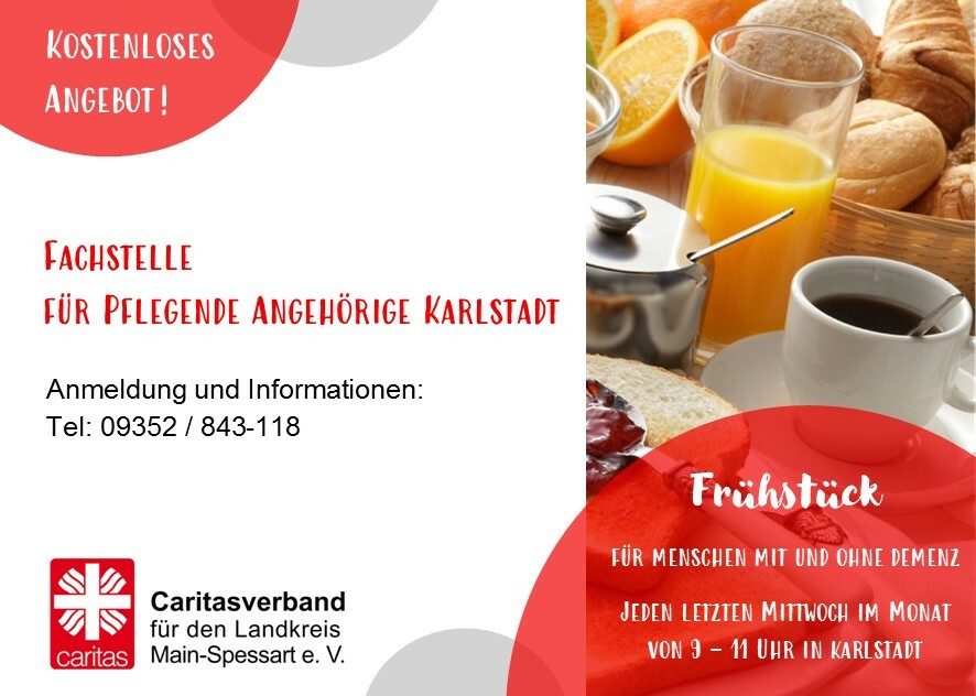 Ab dem 25. Mai 2022 bietet die Fachstelle für pflegende Angehörige Karlstadt des Caritasverbandes Main-Spessart e.V. ein Frühstück für Menschen mit und ohne Demenz an. Es wird jeden letzten Mittwoch im Monat von 9 bis 11 Uhr in den Räumen des Pfarrheims St. Maria, am Kirchplatz 16 in 97753 Karlstadt stattfinden. Das erste gemeinsame Frühstück startet mit einer kleinen Andacht. Eingeladen sind insbesondere Angehörige gemeinsam mit erkrankten Freunden oder Familienmitgliedern. Begleitet wird das Frühstück durch die Mitarbeiterinnen der Fachstelle für pflegende Angehörige und ehrenamtliche Helferinnen. Das monatliche Treffen soll den Austausch ermögliche, aber auch als positives Erlebnis wahrgenommen werden. Die Teilnahme ist kostenlos. Interessent:innen dürfen sich gerne telefonisch unter der Nummer 09352/843118 oder per Mail: Diese E-Mail-Adresse ist vor Spambots geschützt! Zur Anzeige muss JavaScript eingeschaltet sein! anmelden und informieren.
