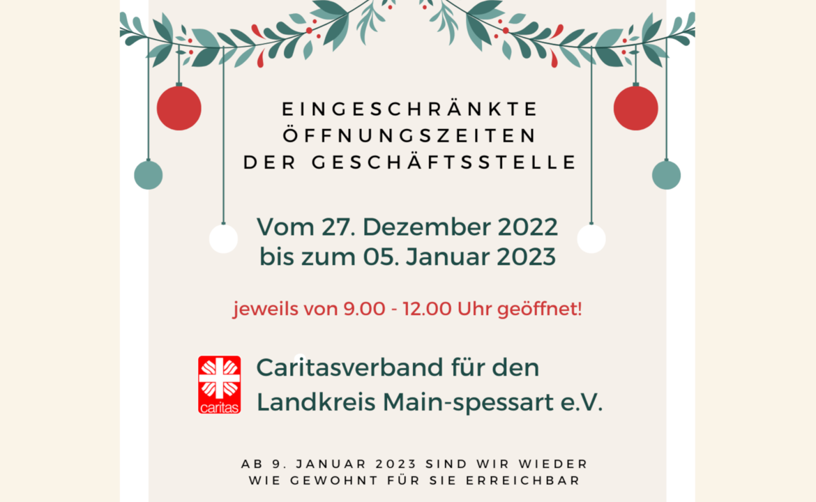 In der Zeit vom 27. Dezember 2022 bis zum 05. Januar 2023 ist die Geschäftsstelle des Caritasverbandes mit seinen Beratungsdiensten nur eingeschränkt erreichbar.