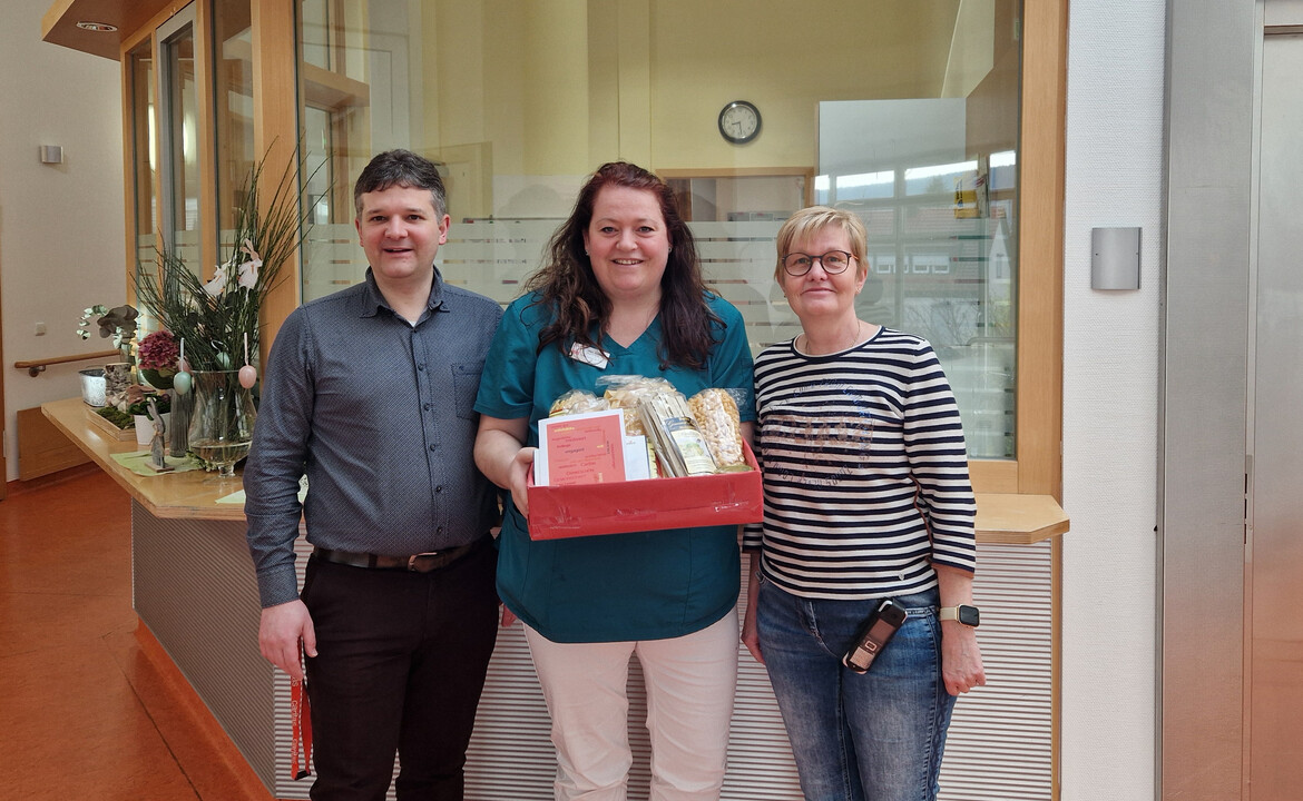 Wir gratulieren Frau Carmen Kolbert recht herzlich zum 25-jährigen Dienstjubiläum. Sie unterstützt uns in unserem Caritas-Seniorenzentrum St. Martin als Pflegefachkraft im Bereich Rosengarten. Mit einem Nudelpräsentkorb bedankten sich Geschäftsführer Florian Schüßler und Pflegedienstleitung Monika Kohl für die langjährige Zusammenarbeit. Wir freuen uns sehr, dass Frau Kolbert schon so lange Teil unserer Dienstgemeinschaft sind und wünschen Ihr weiterhin viel Freude bei ihren Aufgaben.💚