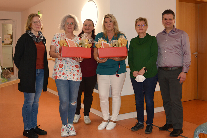 Wir gratulieren Frau Kunze-Dipli und Frau Rama recht herzlich zum 15-jährigen Dienstjubiläum. Beide unterstützen uns in unserem Caritas-Seniorenzentrum St. Martin als Pflegehelferinnen im Wohnbereich Buchental. Mit einem Nudelpräsentkorb bedankten sich Geschäftsführer Florian Schüßler, Einrichtungsleiterin Emelie Schneider und Pflegedienstleiterin Monika Kohl für die langjährige Zusammenarbeit. Wir freuen uns sehr, dass beide schon so lange Teil unserer Dienstgemeinschaft sind und wünschen Ihnen weiterhin viel Freude bei ihren Aufgaben.