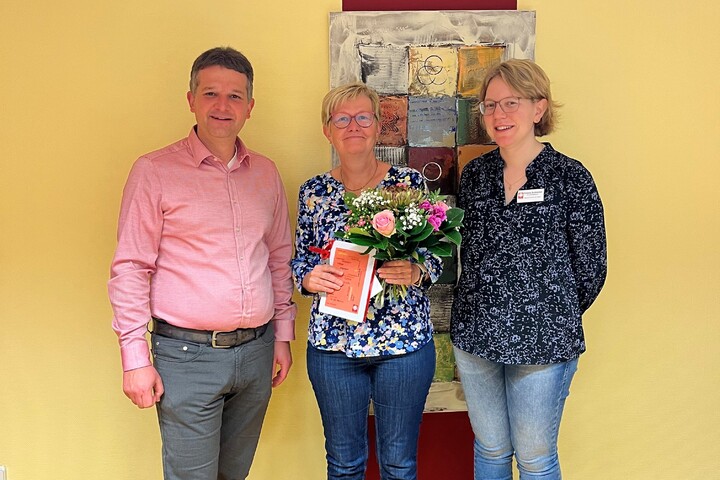Bereits 40 Jahre ist Monika Kohl (Mitte) Teil unserer Dienstgemeinschaft und als Pflegedienstleiterin in unserem Caritas-Seniorenzentrum St. Martin tätig. Wir freuen uns sehr, dass sie uns all die Jahre die Treue gehalten hat und uns mit ihrem Fachwissen eine wertvolle Stütze ist. Es gratulierten herzlich und im Namen der ganzen Vorstandschaft Florian Schüßler, Geschäftsführer und Emelie Schneider, Einrichtungsleiterin Seniorenzentrum. Wir wünschen Frau Kohl alles Gute und weiterhin viel Freude bei ihrer Arbeit.