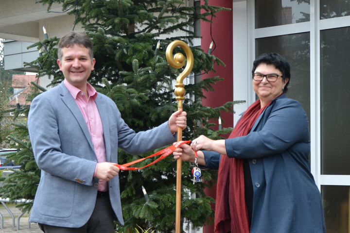 Seit 01. Januar 2022 leitet Florian Schüßler als Geschäftsführer die Geschicke des Caritasverbandes f. d. Landkreis Main-Spessart e. V.. Er tritt somit die Nachfolge von Frau Gabriele Kimmel an, die sich nach 33 Jahren im Verband in den wohlverdienten Ruhestand verabschiedet hat. Symbolisch überreichte Kimmel den Hirtenstab und den Generalschlüssel des Kreiscaritasverbandes.
