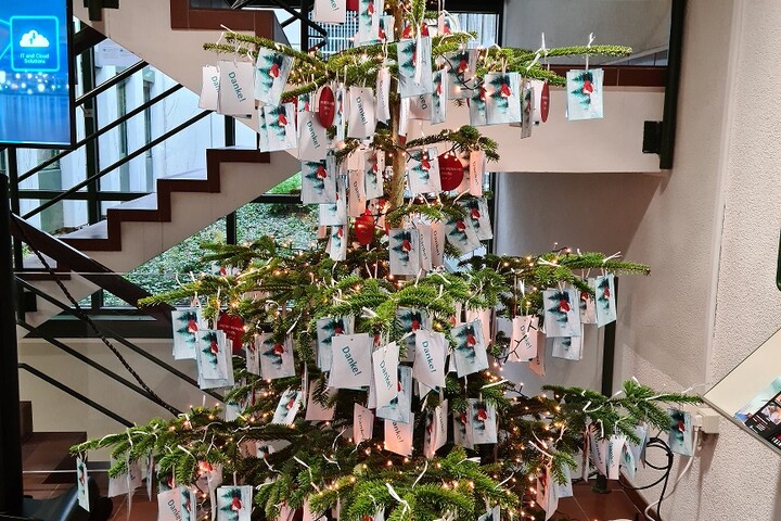 In diesem Jahr findet erstmals die Aktion Weihnachtswunschbaum statt. Die Mitarbeitenden der Bosch Rexroth AG erfüllen den Bewohnerinnen des Caritas-Seniorenzentrums St. Martin kleine Weihnachtswünsche im Wert von bis zu 10€. Die Betreuungsassistentinnen sammelten hierfür bereits im November die Wünsche und notierten sie auf Karten. Diese hängen nun bei dem Lohrer Unternehmen am geschmückten Weihnachtsbaum.