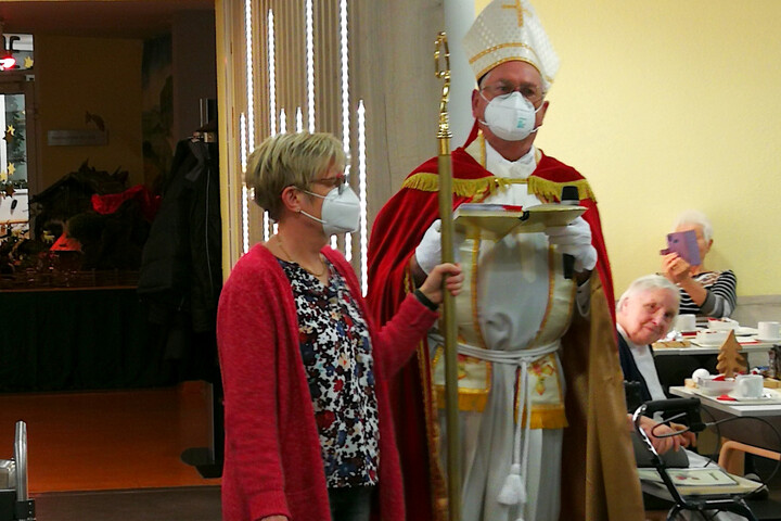 Auch wenn der Nikolaus aufgrund der Hygiene-und Abstandsregeln den Senioren nicht die Hand reichen durfte, war die Freude groß als der stattliche heilige Bischof Nikolaus das Haus betrat.