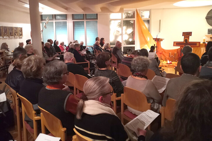 „Christus, dein Licht, erstrahlt auf der Erde und du sagst uns: Auch ihr seid das Licht“ erklang es aus der von Kerzenschein beleuchteten Kapelle des Caritas Seniorenzentrums St. Martin. Am 03.12.19 lud der Caritasverband für den Landkreis Main-Spessart zusammen mit evangelischer und katholischer Kirche zu einer ökumenischen Taizé-Andacht ein. Um Licht in die trübe Jahreszeit zu bringen war der Altarraum der Kapelle, wie üblich bei Taizé-Gebeten, mit Kerzen und bunten Tüchern geschmückt und strahlte eine warme Atmosphäre aus. Der Caritas-Mitarbeiterchor unter der Leitung von Silvia Schäfer begleitete die Andacht musikalisch und wurde tatkräftig von den Anwesenden unterstützt. Rund 50 Personen aus den Gemeinden, dem Seniorenzentrum und aus den Diensten der Caritas nahmen daran teil. Die Anwesenden beteten und sangen gemeinsam, wurden still und trugen ihre Anliegen vor Gott. Sehr berührend wurde es, als viele Besucherinnen und Besucher aufstanden, eine Kerze am Altar entzündeten und eine Fürbitte für Verstorbene, Kranke oder persönliche Sorgen vorbrachten. Das Organisationsteam freut sich sehr, dass so viele ihren Alltag der ersten Adventswoche unterbrochen haben um abzuschalten und durch den meditativen Charakter der Andacht eine Stunde bei sich selbst zu verweilen. Beim anschließenden Beisammensein mit Plätzchen und Punsch war eine Beseeltheit unter den Teilnehmenden zu spüren, die zeigt, dass der Geist dieser Andacht in der Stille des Herzens weiter klingt. Sehr oft kam die Frage auf, wann macht ihr das wieder. So können Sie lieber Leser, liebe Leserin, sicher sein – eine Einladung folgt.