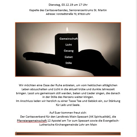 Die evangelische und katholische Kirche sowie die Caritas in Lohr laden alle Interessierten herzlich zu einer ökumenischen Taizé-Andacht ein.