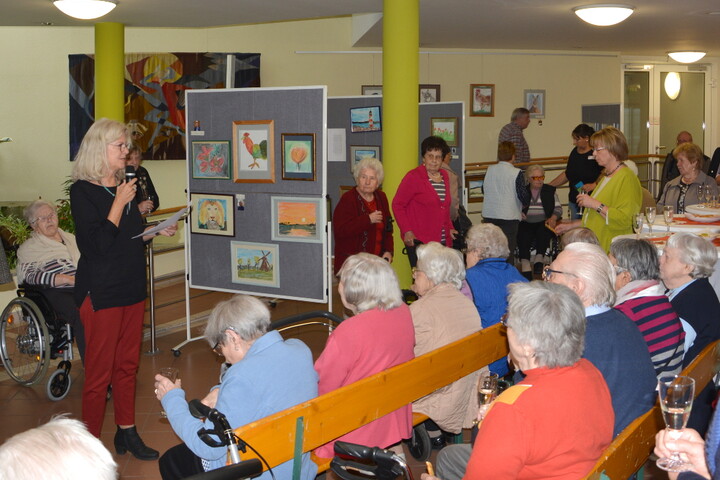 Die Feierlichkeiten starteten um 10 Uhr mit einem Gottesdienst, zelebriert von Monsignore Manfred Sand und Diakon Remi Rausch. Die musikalische Begleitung übernahm die Veehafengruppe „Martinszupfer“ unter Leitung von Petra Helfrich. Im Anschluss wartete neben dem Sektempfang noch eine besondere Überraschung auf Bewohner/innen und Gäste. Anlässlich des Martinsfestes eröffnete im Eingangsbereich des Seniorenzentrums eine Kunstaustellung. Ausstellende Künstler sind Bewohnerinnen und Bewohner der Einrichtung. Alle 14 Tage treffen sich im Veranstaltungsraum Interessierte um unter Anleitung von Christine Hartmann-Manzke und Hartwig Kolb ihre kreativität auszuleben und gemeinsam zu zeichnen und zu malen. Unterstützt werden sie dabei von Rosina Waltl. Nun bekamen die Künstler die Chance ihre Werke zu präsentieren und wurden viel für ihren Mut, ihre Fertigkeiten und Kreativität gelobt. Die gerahmten und sehenswerten Werke werde noch bis Weihnachten im Foyer des Caritas-Seniorenzentrums zu sehen sein.