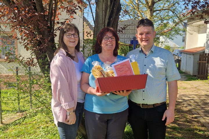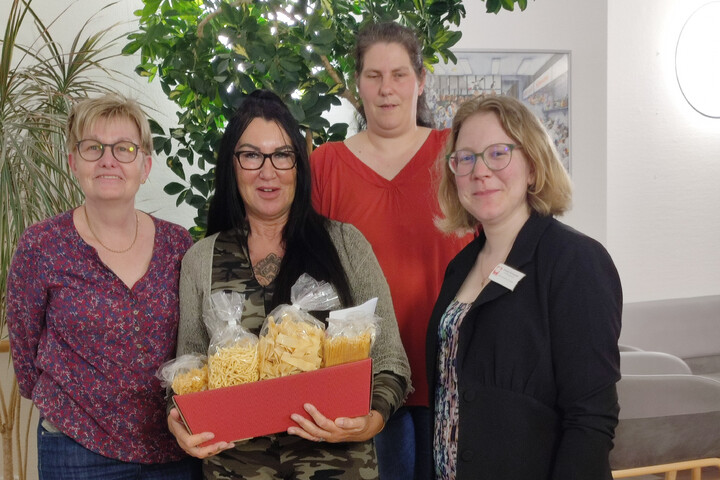 Mit einem Nudelpräsentkorb bedankten sich Einrichtungsleiterin Emelie Schneider, Pflegedienstleiterin Monika Kohl und Wohnbereichsleiterin Yvonne Müller für die langjährige Zusammenarbeit. 💜