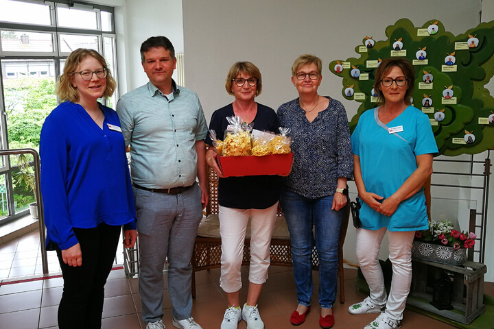 Mit einem Nudelpräsentkorb bedankten sich Geschäftsführer Florian Schüßler, Einrichtungsleiterin Emelie Schneider, Pflegedienstleiterin Monika Kohl und Wohnbereichsleiterin Ingrid Kambach für die langjährige Zusammenarbeit. 💜