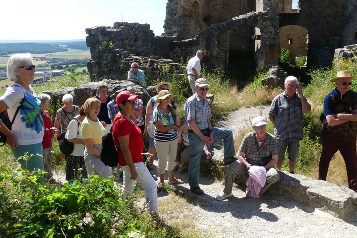 Nach der Begrüßung durch die Heimleiterin Ursula Franz-Mahr ging es mit dem Bus zur Pension Heuler in Eußenheim, wo auf die Teilnehmer ein feudales Frühstück wartete, das keine Wünsche offen ließ. So gestärkt wurden sie von Maria Hoßmann (Kreis- und Bezirksbäuerin, sowie Kreis- und Bezirksrätin) in die Weinberge geführt. Aus kompetentem Mund erfuhren die Teilnehmer vieles rund um den Wein. Selbstverständlich wurde die Theorie an geeigneter Stelle durch eine Weinprobe ergänzt. Und obwohl der Tag heiß war, war der Gang durch die Weinberge sehr interessant. Nach Kaffee und Kuchen wartete eine weitere Überraschung: Auf der Ruine Homburg empfingen der Hausherr Dietrich II. von Hohenberg und seine Gemahlin Berta von Hohenberg (dargestellt von Manfred Kleinwechter und Annemarie Heuler) zu einem Rundgang in ihrer Burg. Welches Ausmaß die Burg einst hatte, wurde im Bild gezeigt und schließlich war die Besichtigung der Burg ein richtiges Erlebnis mit vielen kurzweiligen Eindrücken in das höfische Leben der damaligen Zeit. Den Tag beendete ein Abschlussmahl, serviert von einer Gesindefrau. Organisiert wurde der Ausflug von Silvia Schäfer, Sozialdienst Seniorenzentrum. Ihr gebührt ein großes Lob für die Gestaltung eines wunderbaren Tages.