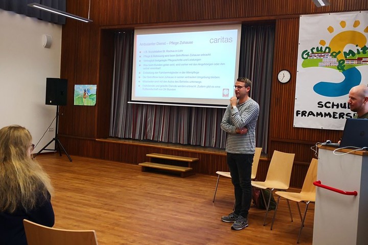 Am 12.11.2018 besuchten Simon Schaub, Pflegefachkraft im Seniorenzentrum St. Martin in Lohr und Antonia Siegler, Leitung des Fachbereiches Kinder- und Jugendhilfe, beide Caritasverband Main-Spessart sowie der Geschäftsführer der Sozialstation St. Rochus in Lohr Sebastian Puglisi die Mittelschule Frammersbach, um dort Schülerinnen und Schüler über Pflegeausbildungsberufe zu informieren.