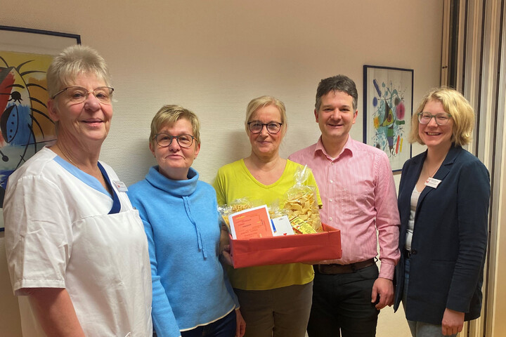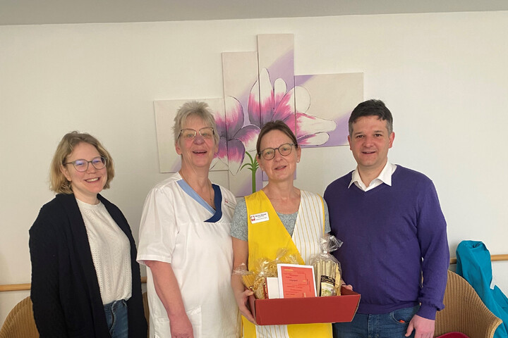 Wir gratulieren Frau Martina Hespelein recht herzlich zum 15-jährigen Dienstjubiläum. Sie unterstützt uns in unserem Caritas-Seniorenzentrum St. Martin als hauswirtschaftliche Mitarbeiterin. Ab heute fängt Frau Hespelein als Pflegeassistenz bei uns an. Mit einem Nudelpräsentkorb bedankten sich Geschäftsführer Florian Schüßler, Einrichtungsleiterin Emelie Schneider, Sonja Salomon Leitung Hauswirtschaft und Pflegedienstleiterin Monika Kohl für die langjährige Zusammenarbeit. Wir freuen uns sehr, dass Frau Hespelein schon so lange Teil unserer Dienstgemeinschaft sind und wünschen Ihr weiterhin viel Freude bei ihren Aufgaben.