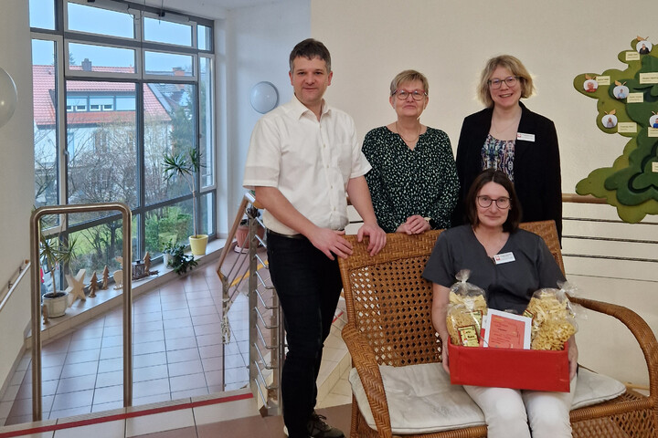 Wir gratulieren Frau Mercia Steigerwald recht herzlich zum 10-jährigen Dienstjubiläum. Sie unterstützt uns in unserem Caritas-Seniorenzentrum St. Martin als Pflegehelferin im Wohnbereich Blumenwiese. Mit einem Nudelpräsentkorb bedankten sich Einrichtungsleiterin Emelie Schneider und Pflegedienstleiterin Monika Kohl für die langjährige Zusammenarbeit. Wir freuen uns sehr, dass Frau Steigerwald schon so lange Teil unserer Dienstgemeinschaft sind und wünschen Ihr weiterhin viel Freude bei ihren Aufgaben.