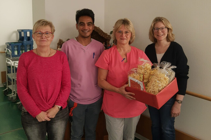 Wir gratulieren Frau Michaela Schuhmann recht herzlich zum 20-jährigen Dienstjubiläum. Sie unterstützt uns in unserem Caritas-Seniorenzentrum St. Martin als Pflegehelferin im Wohnbereich Blumenwiese. Mit einem Nudelpräsentkorb bedankten sich Einrichtungsleiterin Emelie Schneider, Pflegedienstleiterin Monika Kohl und Wohnbereichsleitung Joebanie für die langjährige Zusammenarbeit. Wir freuen uns sehr, dass Frau Schuhmann schon so lange Teil unserer Dienstgemeinschaft sind und wünschen Ihr weiterhin viel Freude bei ihren Aufgaben.