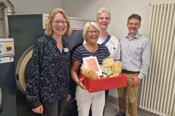 weiterhin tatkräftig das Team der Wäscherei unterstützt. Geschäftsführer Florian Schüßler, Einrichtungsleiterin Emelie Schneider und Hauswirtschaftsleiterin Sonja Salomon überbrachten ihre herzlichsten Glückwünsche und bedankten sich mit einem Nudelpräsentkorb für die jahrelange Unterstützung und Treue. Wir wünschen Frau Amend alles Gute und weiterhin viel Freude bei ihren Aufgaben.