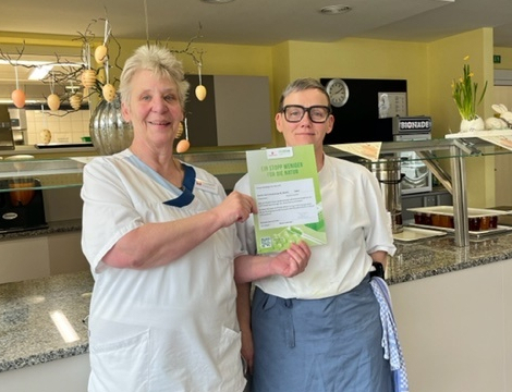 Unser Küchenteam im Seniorenzentrum, vertreten durch die Hauswirtschaftsleitung Frau Salomon und die Küchenleitung Frau Gebhardt, ist durch unseren Lieferanten Transgourmet für ihre besondere Nachhaltigkeit gewürdigt worden. Durch den vorausschauenden Einkauf und Erstellung des Speiseplans für die Bewohner ist es möglich, dass der Lebensmittellieferant nur noch einmal die Woche das Seniorenzentrum anfährt. Hierdurch kann jede Woche eine Fahrt eingespart und unser ökologischer Fußabdruck minimiert werden.